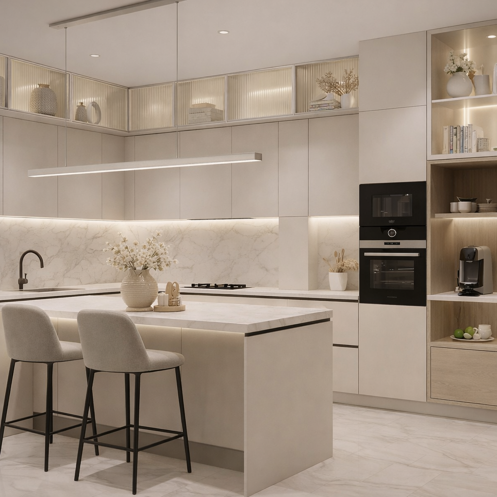 Mūsdienīga, eleganta un funkcionāla virtuves iekārta ar salu, kas apvieno minimālismu ar dabīgiem materiāliem. Gaišie toņi kombinācijā ar siltu koka tekstūru rada mājīgu, bet vienlaikus izsmalcinātu atmosfēru.