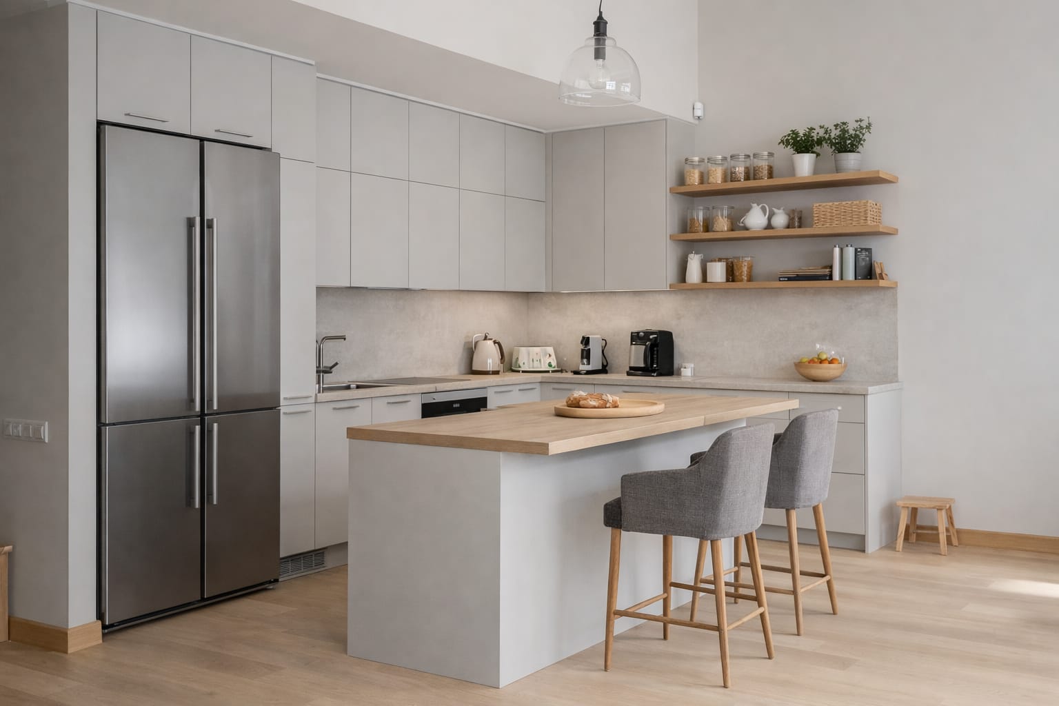 Mūsdienīga, eleganta un funkcionāla virtuves iekārta ar salu, kas apvieno minimālismu ar dabīgiem materiāliem. Gaišie toņi kombinācijā ar siltu koka tekstūru rada mājīgu, bet vienlaikus izsmalcinātu atmosfēru.