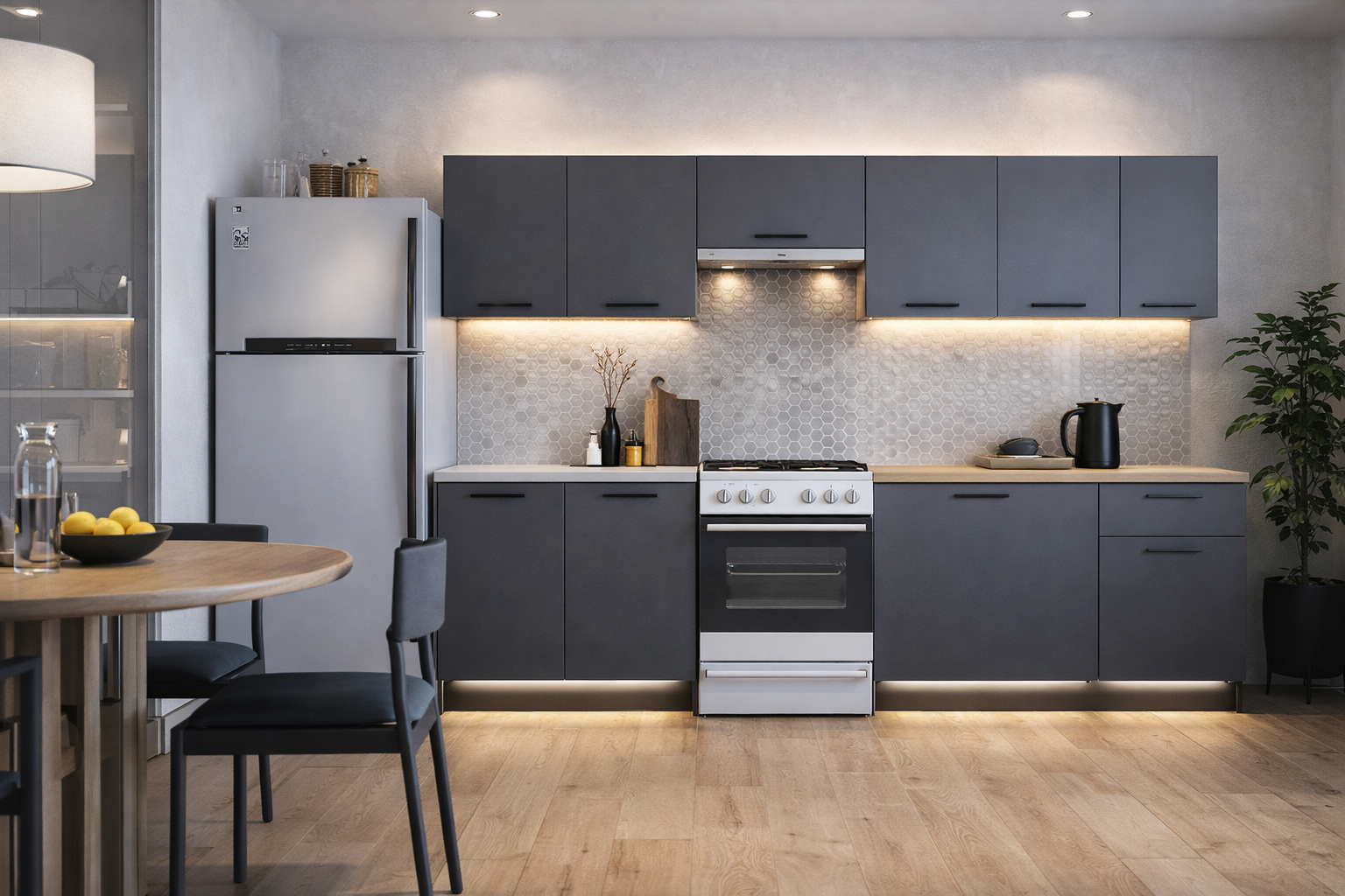 Kvalitatīvas un mūsdienīgas virtuves iekārta ar atvilktnēm un skapīšiem kā arī ar izturīgu virsmu.